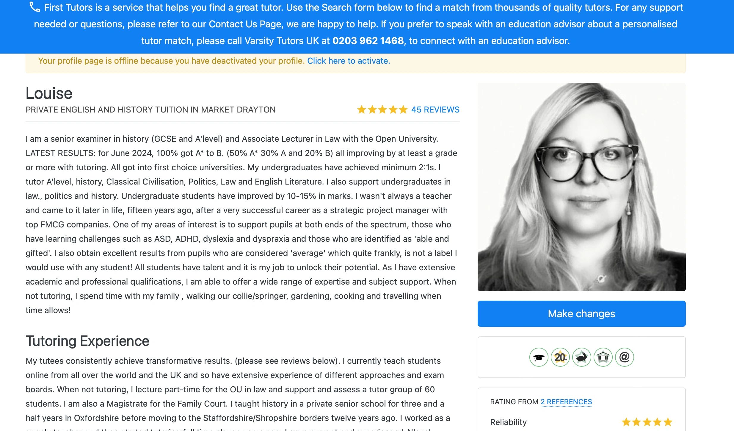 I have 45 5 star reviews on Firsttutors.com. Here is a screenshot of my currently deactivated account.